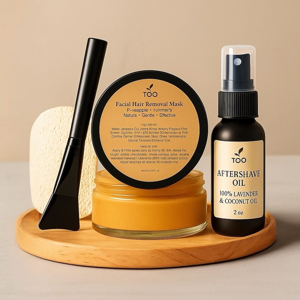 A complete set designed to give your skin a soft, radiant, and hair-free finish. This luxurious kit includes everything you need for a smooth facial hair removal experience: a nourishing Face Hair Removal Mask, soothing Lavender After Shave Oil, a precision Application Brush, and an Exfoliating Pad for glowing, touchable skin.